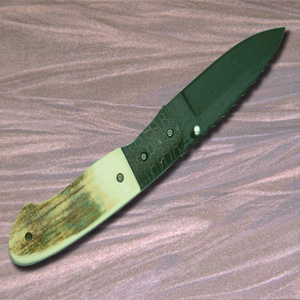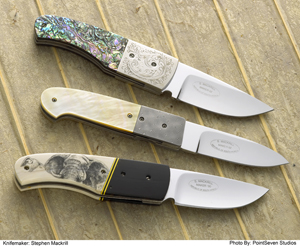 The top folder has a polished blade, stainless steel-engraved bolster, titanium frame and Paua shell handle. The middle folder has a polished blade,stainless steel frame, damascus bolster and gold lip mother of pearl handle. The bottom folder has a polished blade and stainless steel frame.The handle is cape buffalo and hippo tooth ivory, scrimshawed with an elephant head. |
