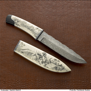 Apocolypse. Hippo tooth handle and sheath. Nickel-silver bolster, and silver top and tail on sheath. Scrimshawed with the four horsemen. |