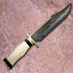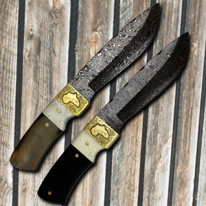 Cape buffalo horn giraffe bone handle. Brass guard, with brass top and tail. Custom carbon damascus blade. |