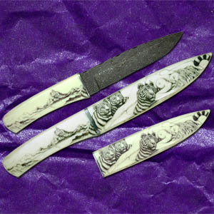 Tiger Lady. Blued damascus blade. Hippo tooth handle with mountain scene scrim. Hippo tooth sheath with tigers and lady scrim. When the handle and sheath are apart, there are two separate scenes, when put together they create one full scene. |