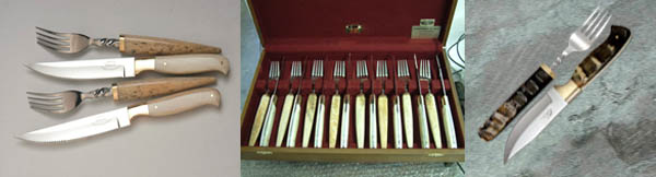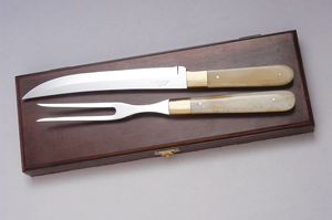 Carving knife and fork with brass bolsters and giraffe bone handles.