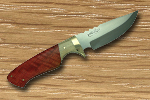 Style 333 hunting knife with a satin finished blade, brass guard and giraffe bone and red ivory wood handle. |
