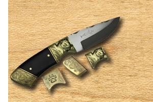 | This hunting knife has a leadwood handle and satin finished blade. There is an end cap and bolster in brass, both of these have been hand-engraved. |