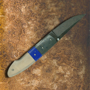 The top folder has a polished blade, stainless steel-engraved bolster, titanium frame and Paua shell handle. The middle folder has a polished blade,stainless steel frame, damascus bolster and gold lip mother of pearl handle. The bottom folder has a polished blade and stainless steel frame.The handle is cape buffalo and hippo tooth ivory, scrimshawed with an elephant head. |