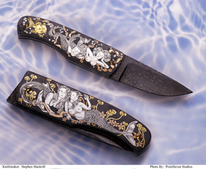 | The Mermaids has a custom made, blued blade. The liners are titanium. The handles are blued steel with 9 grams of platinum, 6 grams of yellow gold and 5 grams of red gold inlaid into both sides of the handle. |
