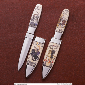 Apocolypse. Hippo tooth handle and sheath. Nickel-silver bolster, and silver top and tail on sheath. Scrimshawed with the four horsemen. |